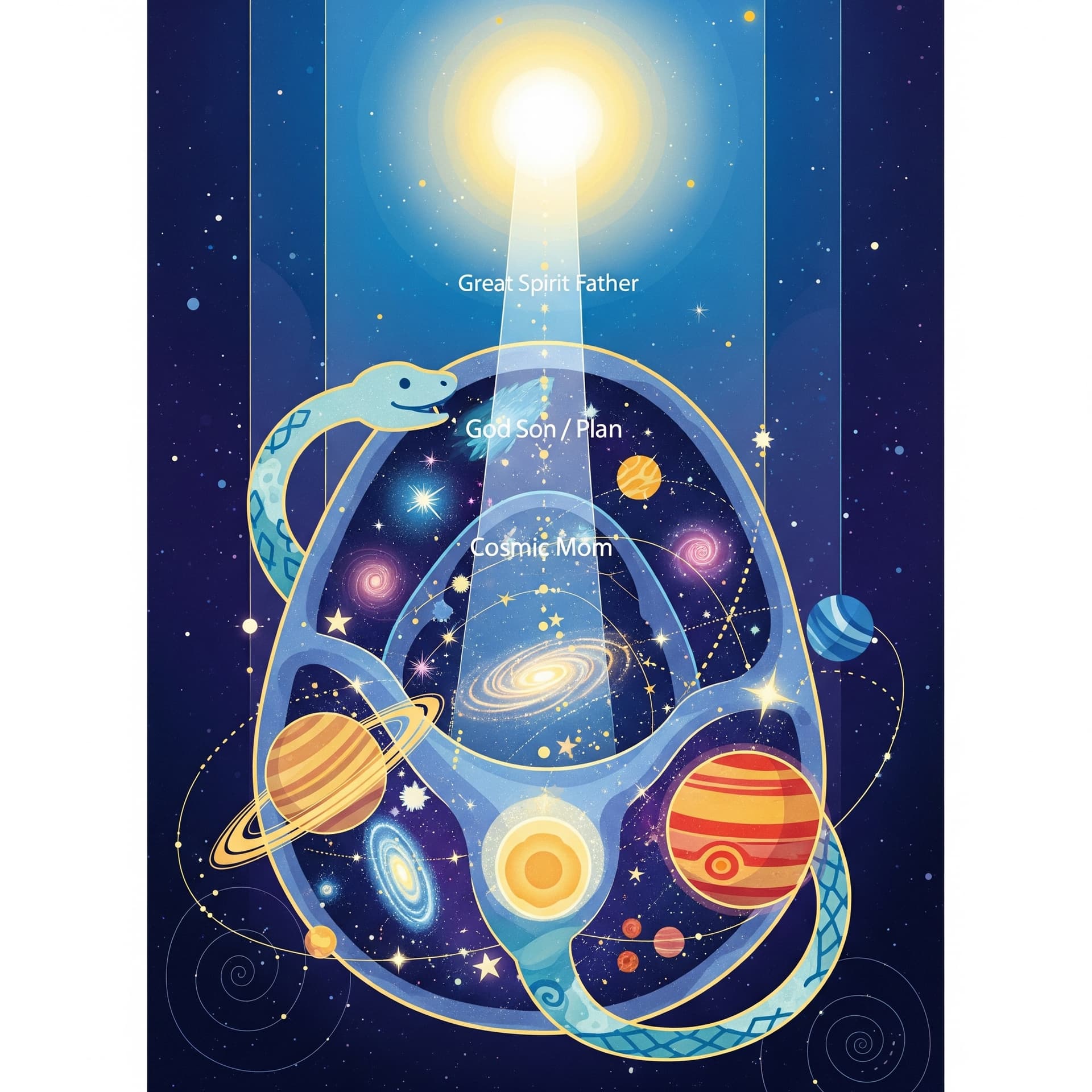 - The Great Spirit (Absolute / God the Father): He’s the very, very most important one! He is the bright, shining Spark at the very beginning of everything. He created everything with His breath. He’s like the heart of the Universe.
